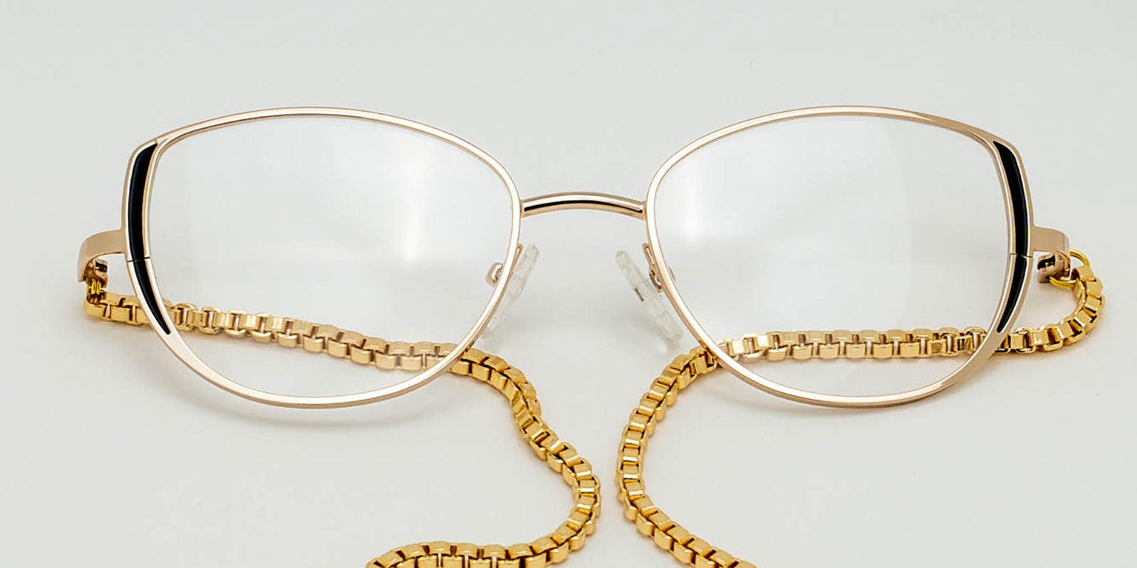Gold metal cat eye frames. Gold chain. Black tourmaline.